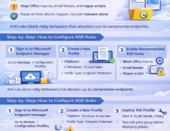 Attack Surface Reduction (ASR) rules are designed to stop these behaviors before they turn into a breach. Think of ASR as a security guard who doesn’t just check IDs at the door, but actively watches for suspicious behavior once someone is inside the building—and steps in immediately when something doesn’t look right.